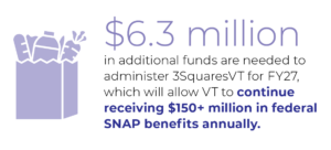 - $6.3 million in additional funds are needed to administer 3SquaresVT for FY27, which will allow Vermont to continue receiving $150+ million in federal SNAP benefits annually