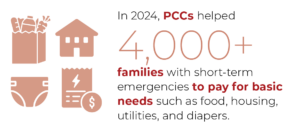 In 2024 PCCs helped over 4,000 families with concrete supports that provided short-term and emergency assistance to pay for basic needs such as food, diapers, utilities, and housing